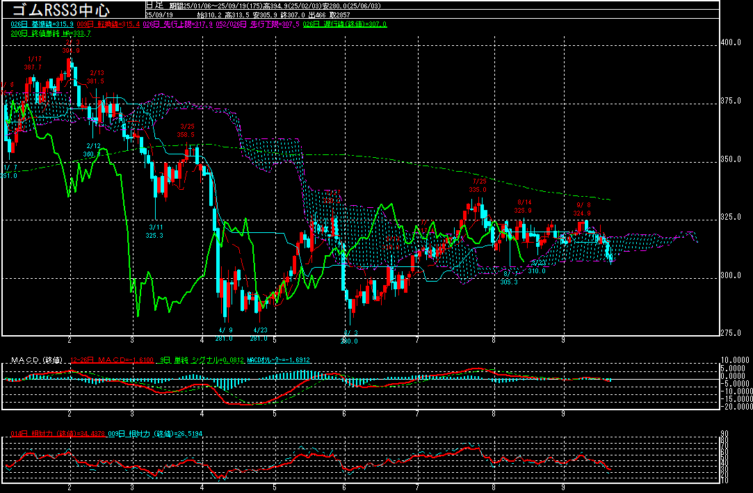 ゴムRSS3(中心限月)は、9月16日に一時322.9円まで上昇する場面もみられるも、1月31日を起点としたダウン・トレンドや一目均衡表の雲の上限でレジスタンスを受け始める中、上値の重い展開が継続。18日に307.0円まで下げる場面もみられるなど、7月7日以来の310円割れで終了。19日に313.5円まで反発する場面もみられるも、日銀金融政策決定会合を受けて円高基調が強まる中、戻り売りの展開となり、305.9円まで下げる場面もみられるなど、一目均衡表の雲を下抜けて終了しております。