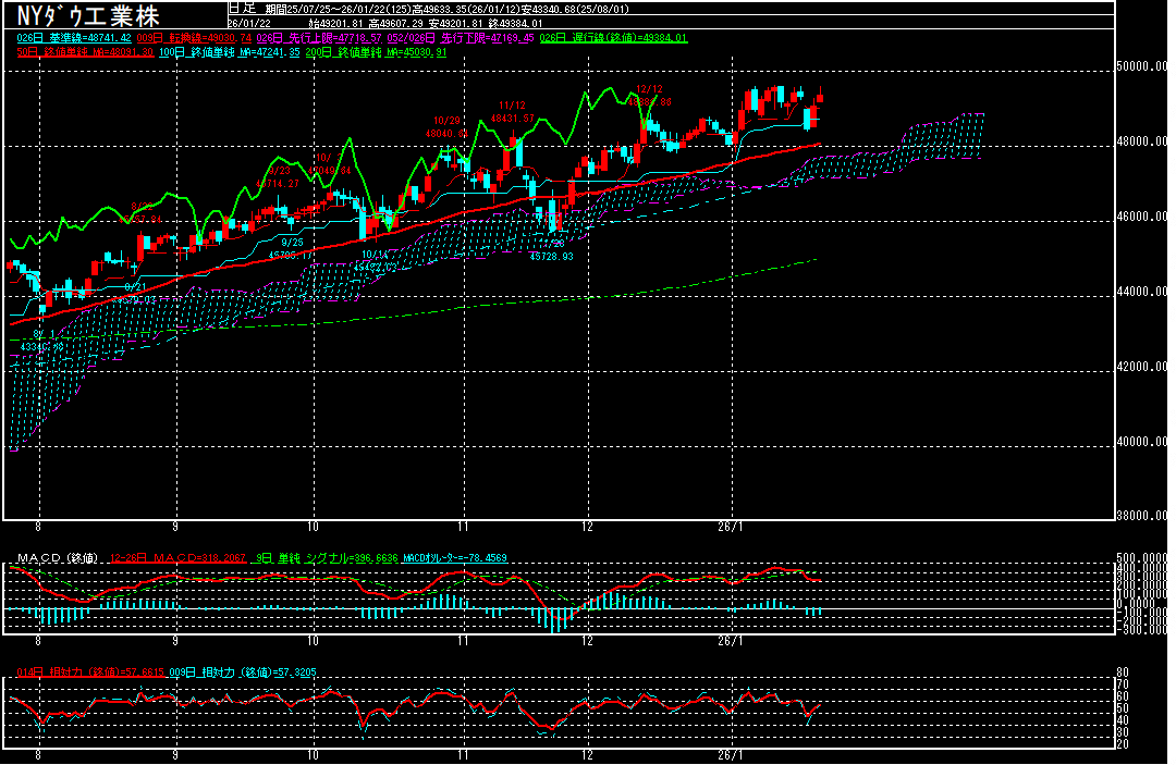 FRBの独立性への疑念や米国のグリーンランド取得を巡る不確実性は残っているものの、米長期金利の上昇が一服したことや、本格化している昨年10-12月期米企業決算で業績や見通しが軒並み好調なことが株価の下支えになっているようです。そのため、このまま1月12日に付けた最高49633.35ドルを上抜き、再度50000ドル超えを試す展開となるか注目されます。