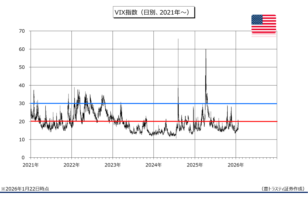 ただ、トランプ米大統領が欧州への追加関税を21日に撤回したため、「TACO(トランプ氏はいつも腰砕け)トレード」の様相が強まり反発。翌22日も続伸となり、49607.29ドルまで上昇する場面も見られております。なお、恐怖指数とも呼ばれるVIX指数が20日に節目の20を上回ったものの、翌21日には16台まで低下しております。