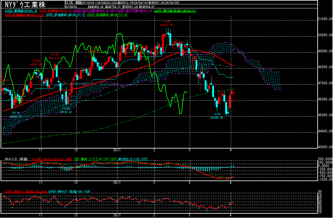 トランプ米大統領が対イラン軍事作戦の早期終結の可能性を示唆したことが好感されて3月31日は急伸となり、4営業日ぶりに46000ドル台を回復。翌4月1日に46803.36ドルまで上昇する場面も見られております。ただ、200日平均線を上抜くことは出来ず。
