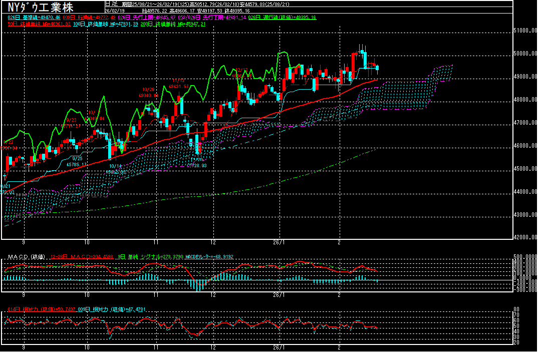 昨晩のダウ工業株30種平均は、前営業日比267.50ドル安の49395.16ドルで終了。2月6日に1ヶ月ぶりに最高値を更新。史上初めて50000ドル台に乗せる中、その後も連日で最高値を更新し、10日に50512.79ドルまで上昇する場面も見られております。ただ、高値警戒感に加えて、人工知能(AI)の普及により既存のビジネスモデルが脅かされるとの懸念が再燃する中、12日は5営業日ぶりに終値で50000ドルを割り込みました。翌13日に49084.35ドルまで下げる場面も見られるも、50日平均線がサポート・ラインとして意識される中、節目の49000ドルは維持しております。