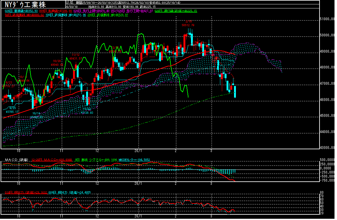 昨晩のダウ工業株30種平均は前営業日比768.11ドル安の46225.15ドルで終了。中東情勢が一段と緊迫化する中、3月10日から13日まで4営業日続落。13日に46494.63ドルまで下げる場面も見られております。その後、原油価格の上昇が一服したことや、エヌビディアが16日に開いたイベントで人工知能(AI)向け半導体の受注額について強気な見通しを示したことを受けて、半導体関連株が買われる中、17日に47000ドル台を回復する場面も見られたものの、18日に急落。