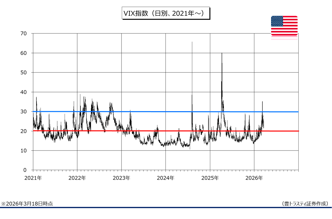 「恐怖指数」とも呼ばれるVIX指数は3月19日時点で25.63と、不安心理が高まった状態とされる20を上回って推移しており、当面は上値の重い展開が続きそうです。
