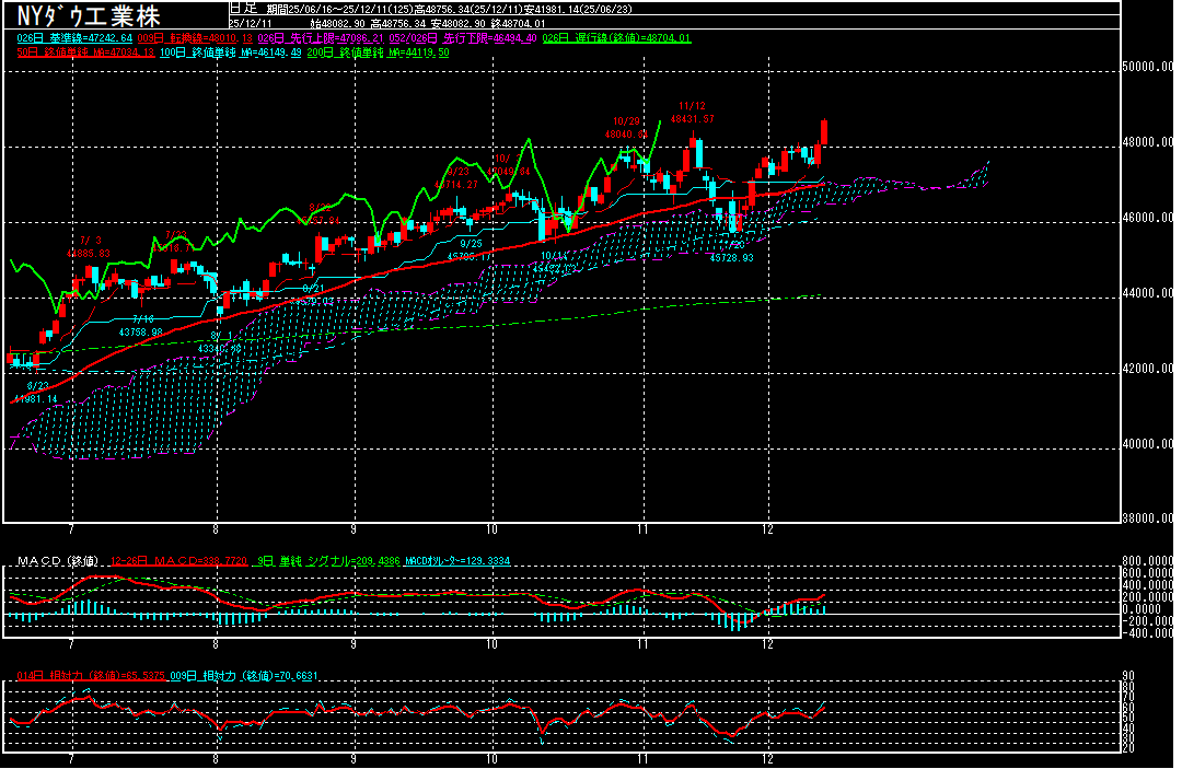 FOMC(米連邦公開市場委員会)を控えて様子見姿勢が強まる中、48000ドルを目前にして足踏みが続いていたものの、FRBがFOMCで3会合連続の利下げを決定したことに加えて、短期国債の買い入れ開始を決定したことが好感され、12月10日に急伸。11月12日以来1ヶ月ぶりに48000ドル台を回復しました。また、翌11日に11月12日の高値48431.57ドルを上抜いて、48756.34ドルまで上昇し、最高値を更新しております。