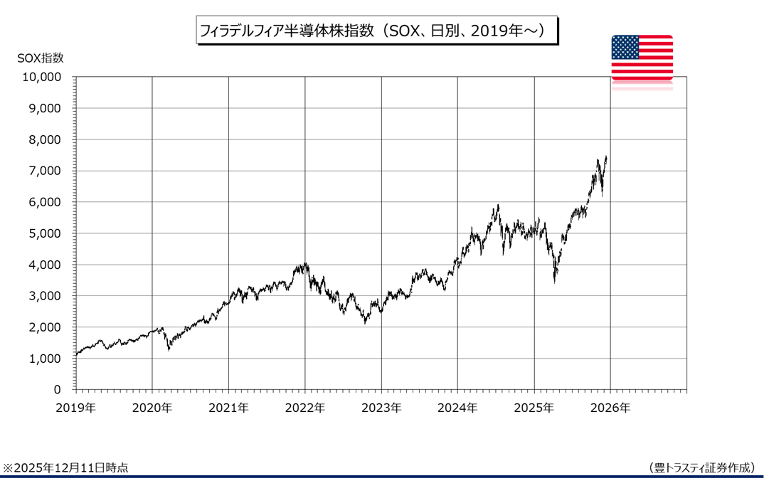 来年の利下げについて、市場では2回程度の利下げを見込む向きが多いものの、FOMC参加者の政策金利見通し(ドットチャート)によると、2026年は1回の利下げが想定されており、前回9月時点の見通しと変わらずでした。ただ、トランプ大統領が指名する次期FRB議長は、金融緩和に前向きな人物が就任するとの期待が勝っている模様。