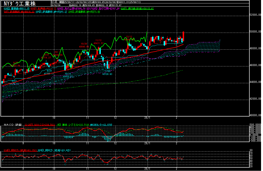 最近大きく下げていたソフトウエア株の売りが一服したことなどで投資家心理が改善する中、ハイテク株を中心に買い進められたようです。1月12日の高値49633.35ドルを上抜いて、一時50169.65ドルまで上昇するなど、最高値を更新。初めて50000ドル台に乗せております。