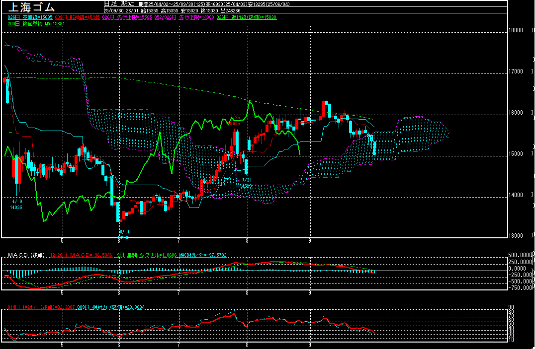 先週の上海ゴム(中心限月)は、前週末比345元安の15030元で終了。4週連続で下落しております。