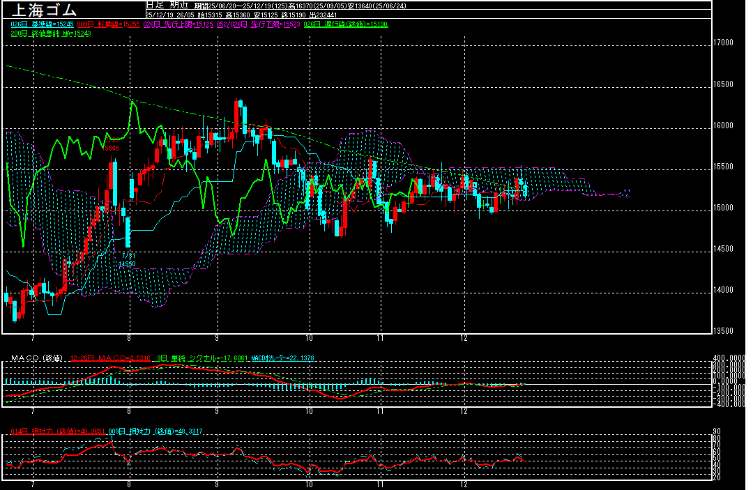 先週の上海ゴム(中心限月)は、前週末比40元安の1万5190元で終了。反落に転じました。上海期貨交易所(SHFE)の天然ゴム在庫は12月19日時点で前週比5343トン増加の11万0885トンと、4週連続で増加しております。