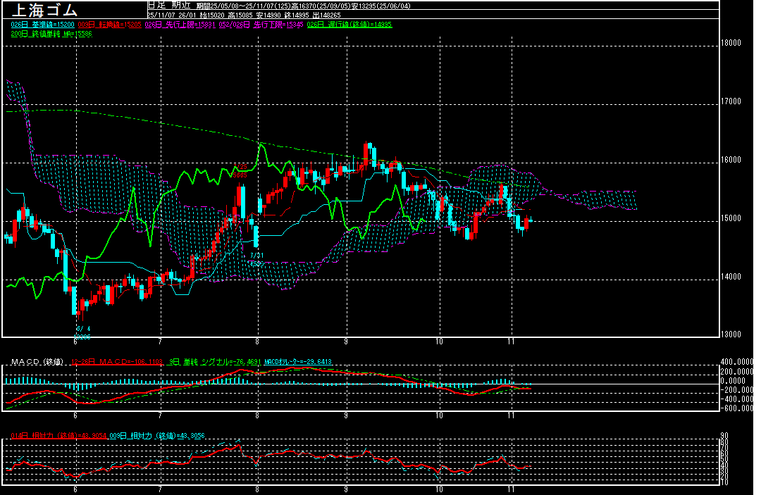 先週の上海ゴム(中心限月)は、週末比90元安の14995元で終了。2週連続で下落となりました。