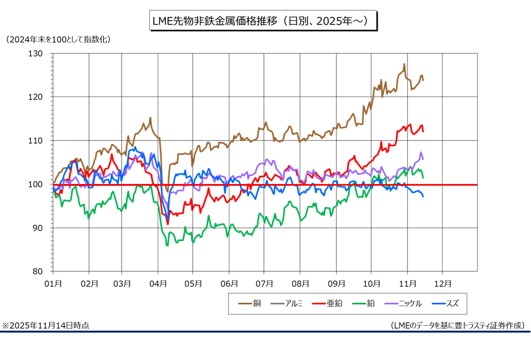 上海期貨交易所(SHFE)指定の非鉄金属在庫(11月14日時点)を見てみると、銅は2週連続で減少。一方、アルミは5週ぶりに増加に転じました。亜鉛も4週ぶりに増加に転じております。鉛は2週連続で増加。ニッケルは7週連続で増加。スズは4週連続で増加しております。