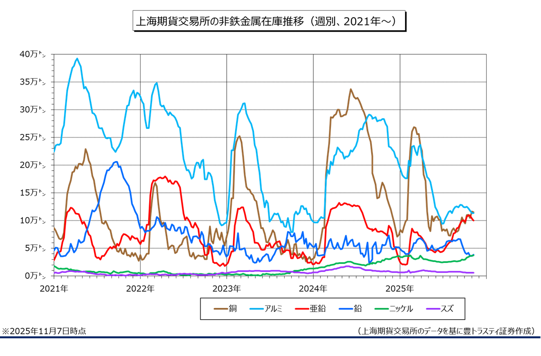 上海期貨交易所(SHFE)指定の非鉄金属在庫