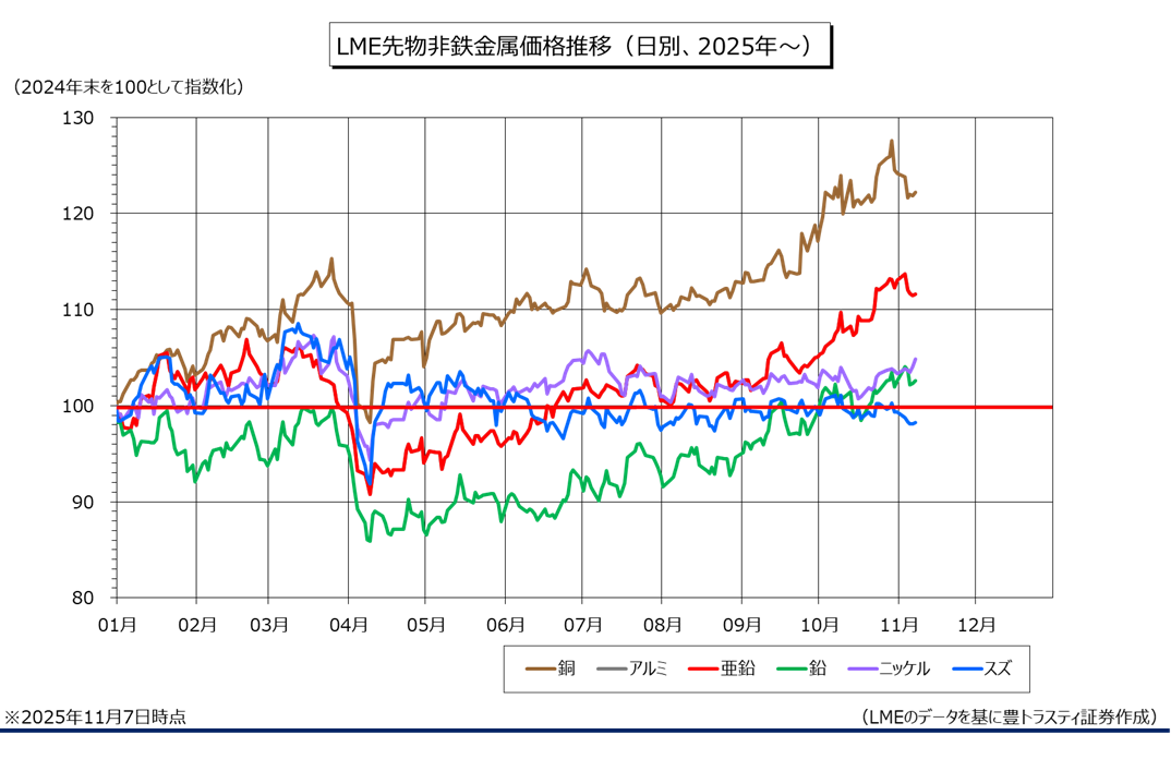 上海期貨交易所(SHFE)指定の非鉄金属在庫(11月7日時点)を見てみると、銅は減少に転じました。アルミは4週連続で減少しております。亜鉛も3週連続で減少。一方で、鉛は3週ぶりに増加に転じました。ニッケルは6週連続で増加。スズは3週連続で増加しております。