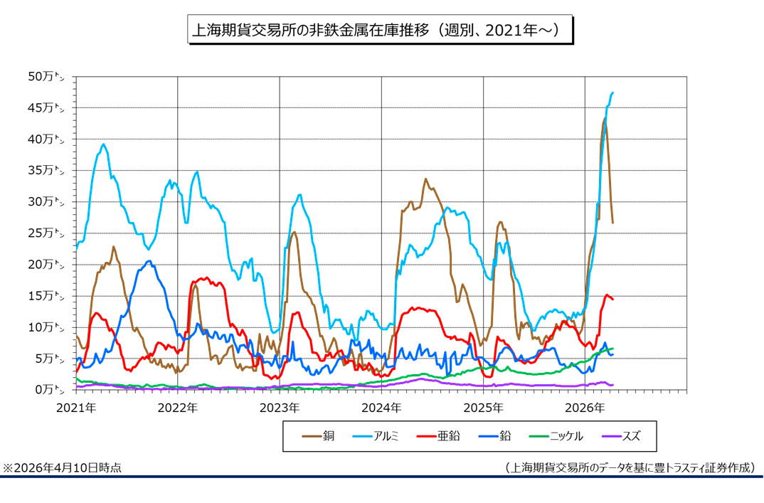 上海期貨交易所(SHFE)指定の非鉄金属在庫(4月10日時点)を見てみると、銅は4週連続で減少。亜鉛は3週連続、鉛は4週連続で減少しております。一方、春節(旧正月)で休場だった2月20日の週を挟んで、アルミは16週連続で増加。スズは4週ぶりに増加に転じ、ニッケルは3週連続で増加しております。
