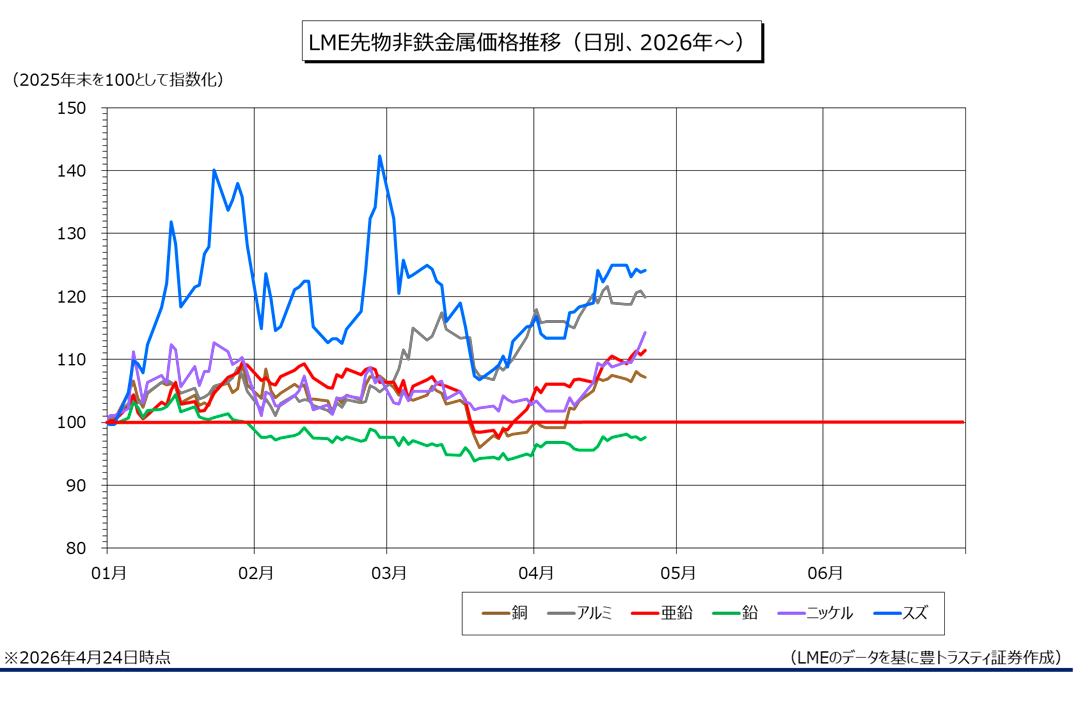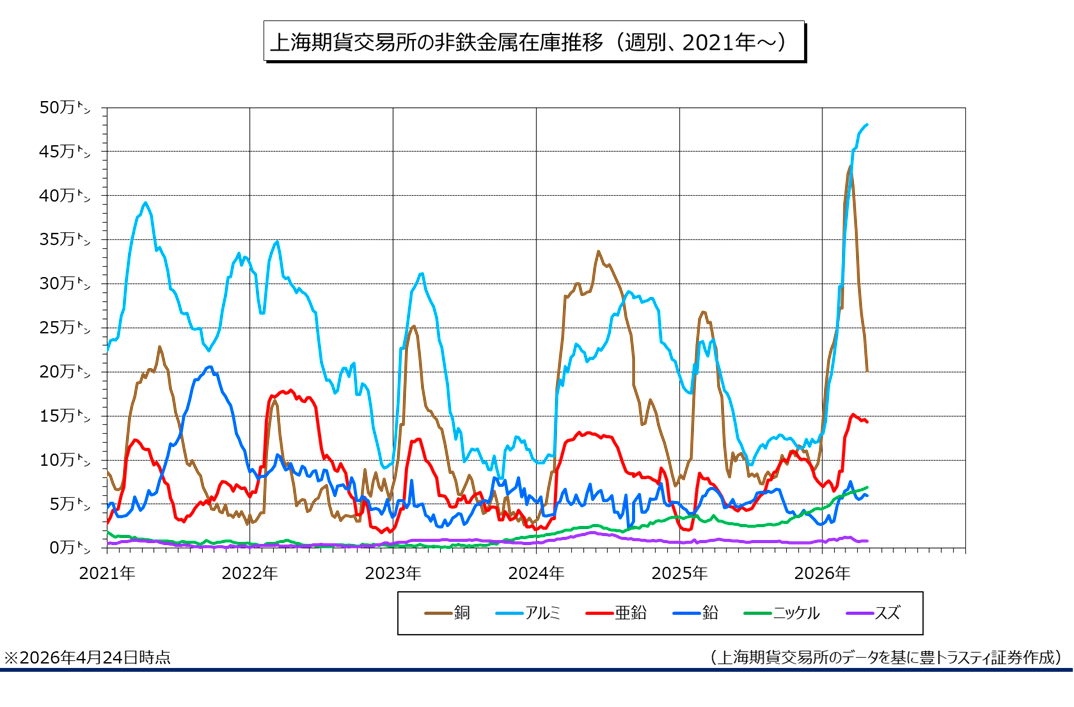 上海期貨交易所(SHFE)指定の非鉄金属在庫(4月24日時点)を見てみると、銅は6週連続で減少。亜鉛は減少に転じ、鉛も3週ぶりに減少に転じました。スズは2週連続で減少。一方、春節(旧正月)で休場だった2月20日の週を挟んで、アルミは18週連続で増加。ニッケルは5週連続で増加しております。