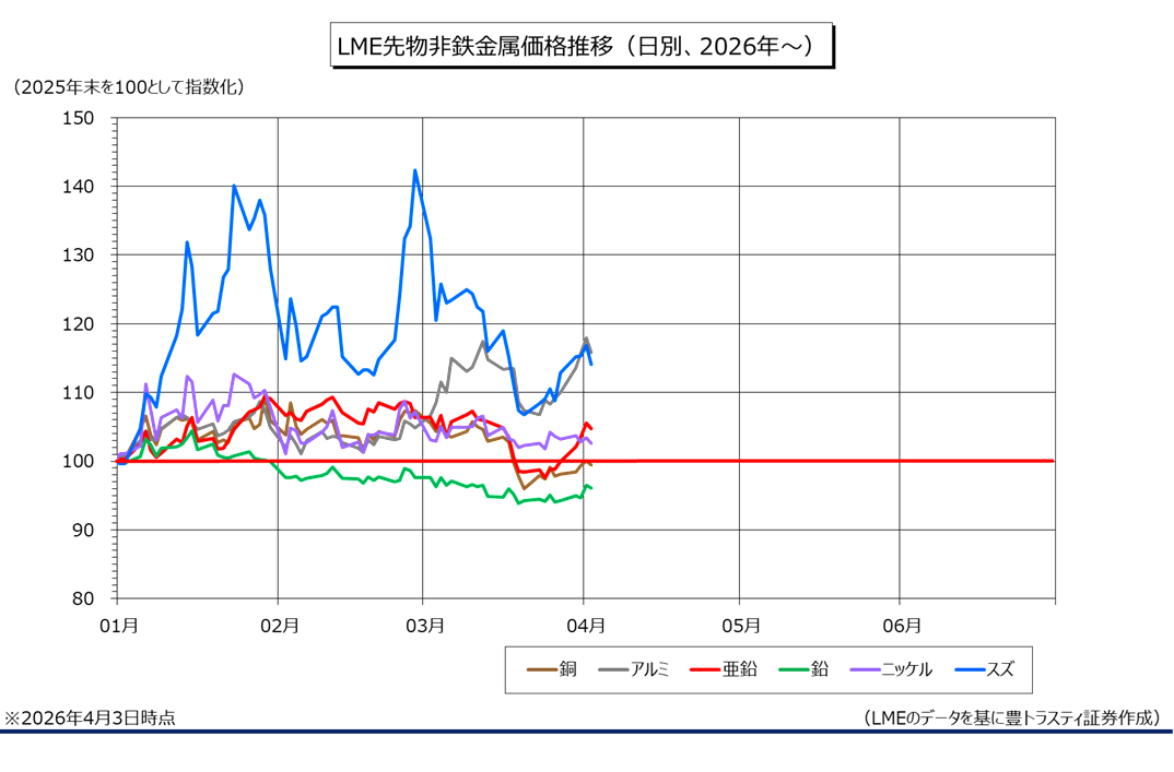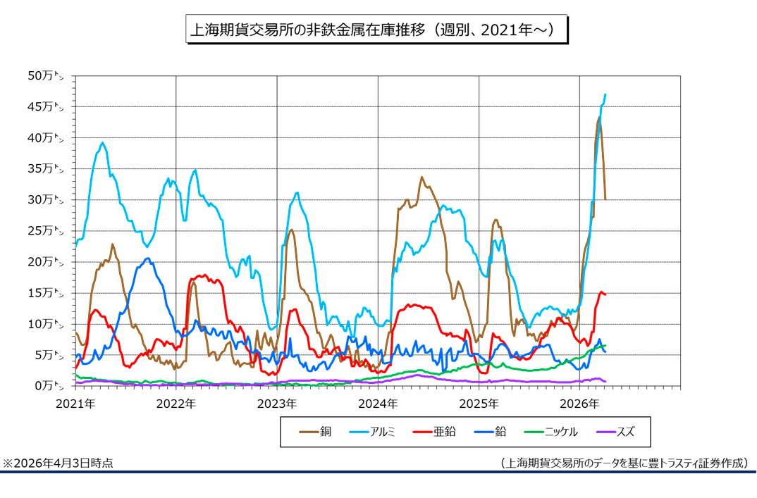 上海期貨交易所(SHFE)指定の非鉄金属在庫(4月3日時点)を見てみると、銅は3週連続で減少。亜鉛は2週連続、鉛とスズは3週連続で減少しております。一方、春節(旧正月)で休場だった2月20日の週を挟んで、アルミは15週連続で増加。ニッケルは2週連続で増加。