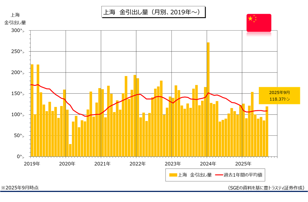 SGE(Shanghai Gold Exchange :上海黄金交易所)によると、9月の金引出し量は118.37トンと、前年同月比3.1%増加。前月(33.40トン)を上回り、4月(153.05トン)以来の高水準となっております。2025年1-9月期累計では前年同期比13.6%減少の974.62トン。
