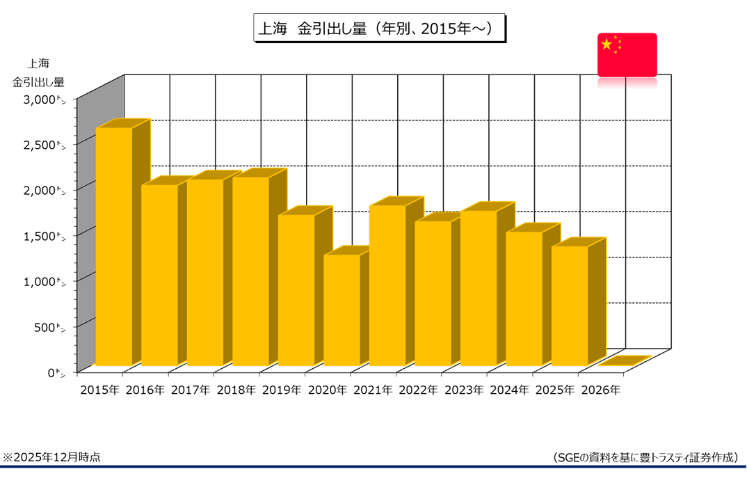 SGE(Shanghai Gold Exchange :上海黄金交易所)によると、2025年金引出し量は、前年比10.8%減少の1297.66トンでした。2年連続でマイナスとなり、2020年(1205.33トン)以来の低水準に留まっております。なお、昨年12月は前年同月比5.8%減の114.74トンでした。
