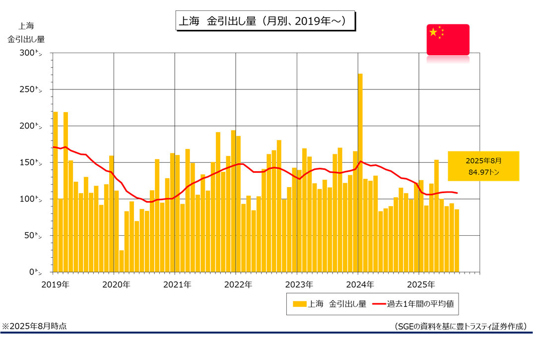 SGE(Shanghai Gold Exchange :上海黄金交易所)によると、7月の金引出し量は84.97トンと、前年同月比16.5%減少。5ヶ月ぶりにマイナスに転じ、昨年5月(82.33トン)以来の低水準にとどまっております。2025年1-8月期累計では前年同期比15.5%減少の856.25トン。