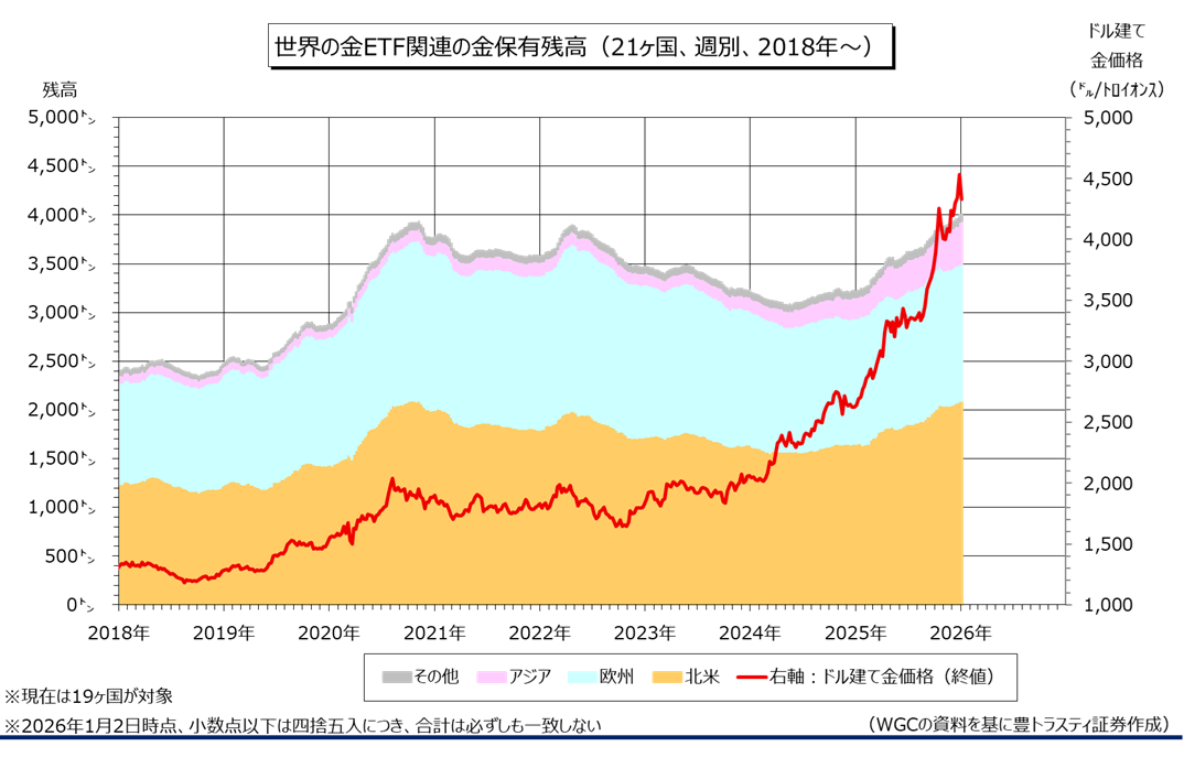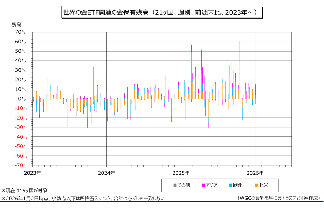 産金業界団体ワールド・ゴールド・カウンシル(WGC)のデータによると、1月2日時点で世界の金ETF(上場投資信託)関連(21ヶ国、現在は19ヶ国)の金保有残高は前週末比10.20トン増加の4009.60トンと、9週連続で増加となりました。
