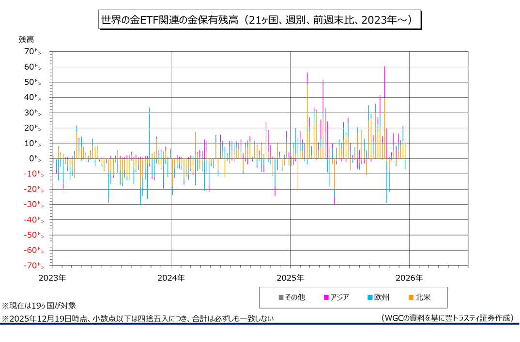 産金業界団体ワールド・ゴールド・カウンシル(WGC)のデータによると、12月19日時点で世界の金ETF(上場投資信託)関連(21ヶ国、現在は19ヶ国)の金保有残高は前週末比2.80トン増加の3958.10トンと、7週連続で増加となりました。