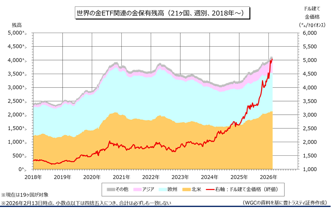 産金業界団体ワールド・ゴールド・カウンシル(WGC)のデータによると、2月13日時点で世界の金ETF(上場投資信託)関連(21ヶ国、現在は19ヶ国)の金保有残高は前週末比14.70トン増加の4117.50トンと、増加に転じました。