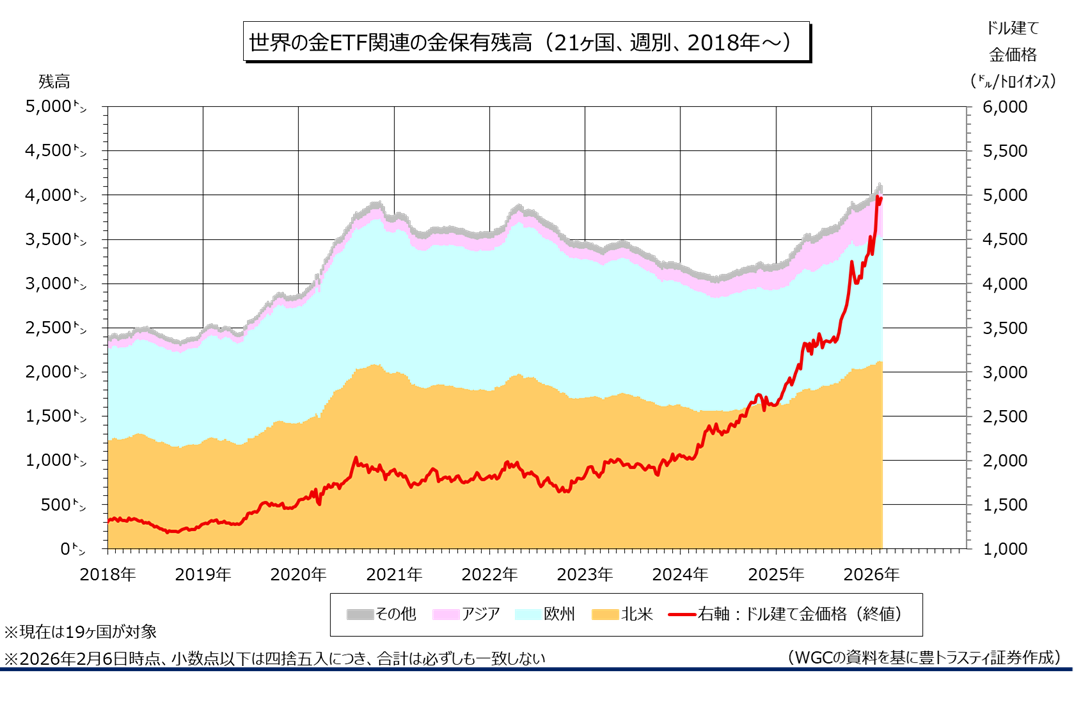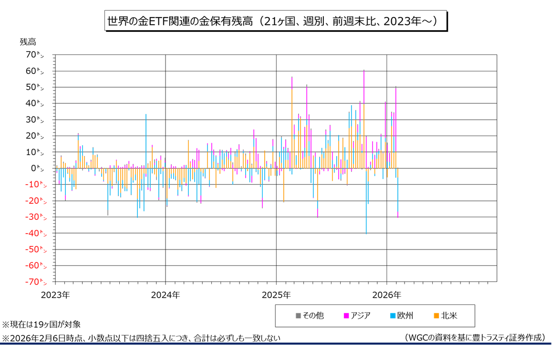 産金業界団体ワールド・ゴールド・カウンシル(WGC)のデータによると、2月6日時点で世界の金ETF(上場投資信託)関連(21ヶ国、現在は19ヶ国)の金保有残高は前週末比30.00トン減少の4102.80トンと、14週ぶりに減少に転じました。