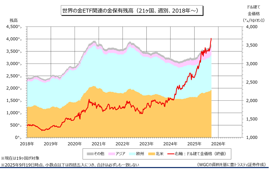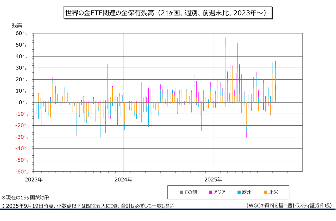 産金業界団体ワールド・ゴールド・カウンシル(WGC)のデータによると、9月19日時点で世界の金ETF(上場投資信託)関連(21ヶ国、現在は19ヶ国)の金保有残高は前週末比35.50トン増加の3770.70トンと、4週連続で増加となりました。