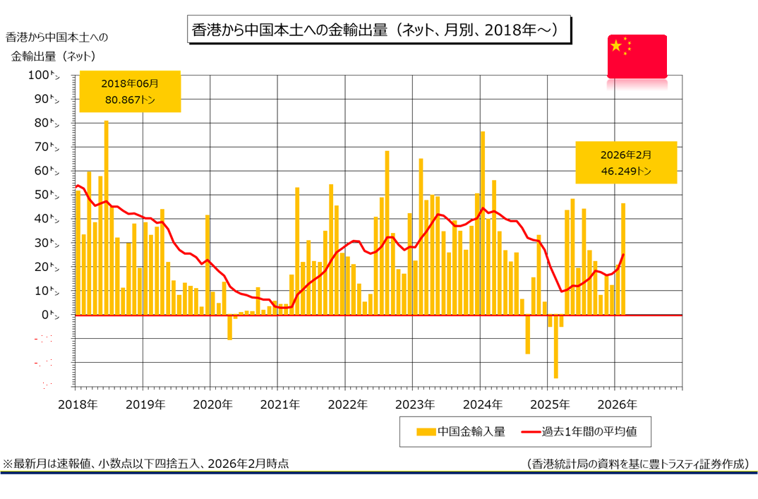 香港政府統計局の発表によると、2月に香港経由で中国が輸入した金輸入量(ネット)は46.249トンでした。前月(20.585トン)を上回り、昨年5月(48.127トン)以来9ヶ月ぶり高水準となっております(前年同月はマイナス26.398トン)。2026年1-2月期累計は66.834トン(前年同期はマイナス31.277トン)。