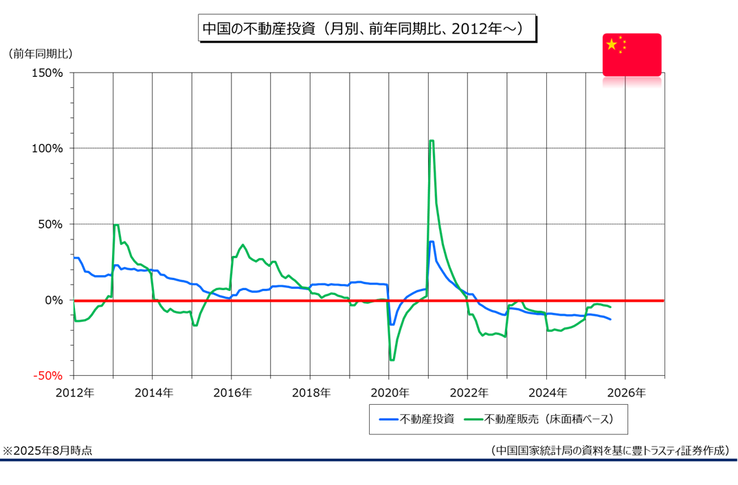 なお、2025年1-8月期中国不動産販売額は前年同期比12.9%減(2025年1-7月期は12.0%減)、新築販売面積は同4.7%減(2025年1-7月期は4.0%減)となっております。