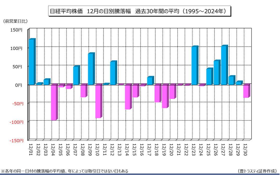 今年も残すところ、あと5営業日(12月23日終了時点)となり、「掉尾の一振」が意識される時期となりました。1995年から2024年の過去30年間の値動きを見てみると、引き続き12月22日以降は上げ易い傾向があります。