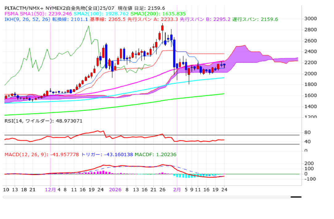 MACDが下げ止まりの動きを見せ始めている上に、一目均衡表の雲がサポート・ラインとして意識され始めているように見えます。独自材料に乏しいものの、相関性の強い金相場の底打ち感が強まるようだと、改めて相対的な割安感や出遅れ感が意識されて、反発に転じる可能性がありそうです。50日平均線および1月26日の高値2925.0ドルから2月6日の安値1806.0ドルの下げ幅をフィボナッチ・リトレースメントで見た場合の38.2%戻し水準2233.5ドルを上抜くことが出来るかが焦点となりそうです。