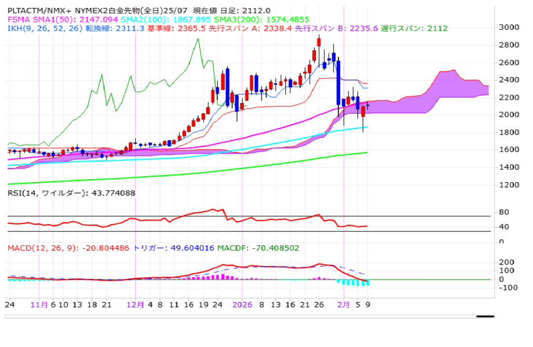 1月20日から26日まで5営業日続伸。連日で最高値を更新する中、1月26日に2925.0ドルまで上昇し、初めて2900ドル台に乗せる場面も見られております。ただ、急ピッチな上昇に対する警戒感が強まる中、トランプ米大統領がFRBの次期議長に元理事のケビン・ウォーシュ氏を指名すると発表。ウォーシュ氏は候補の中では「タカ派」とみられていたことから、FRBの早期利下げ観測が後退し、1月30日に急落。CMEが証拠金引き上げを発表したことも嫌気されたようで、2月2日に1882.0ドルまで下げる場面も見られております。
