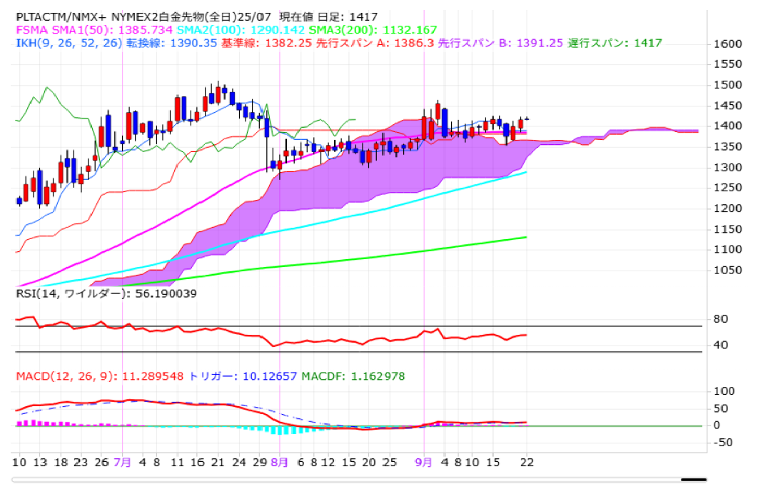 ここまでFRBの利下げを織り込んで推移してきただけに、調整地合いが強まる可能性もありますが、1ヶ月物のリースレートは10%台前半まで低下してきているものの、依然として高水準で推移。白金業界団体「ワールド・プラチナム・インベストメント・カウンシル(WPIC)」が今月公表した最新の需給レポートを受けて、改めて需給のひっ迫感が意識され始める中、8月1日を起点としたアップ・トレンドや一目均衡表の雲に加えて、上抜きつつある50日平均線をサポートに1400ドルを維持しつつ、直近高値1465.0ドル(9月3日)を上抜くことが出来るか注目されます。