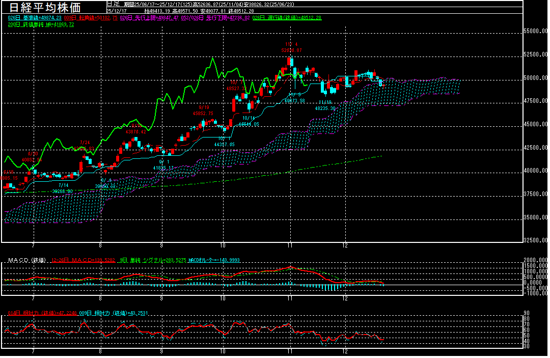 18、19日の両日に日銀金融政策決定会合が行われるため、引き続き積極的な買いが入りづらそうです。テクニカル的に25日平均線を下回り、一目均衡表の雲に入り込んできているだけに、このまま雲の上限もレジスタンスとして意識されるようだと、心理的節目の49000円を割り込むことも想定されます。