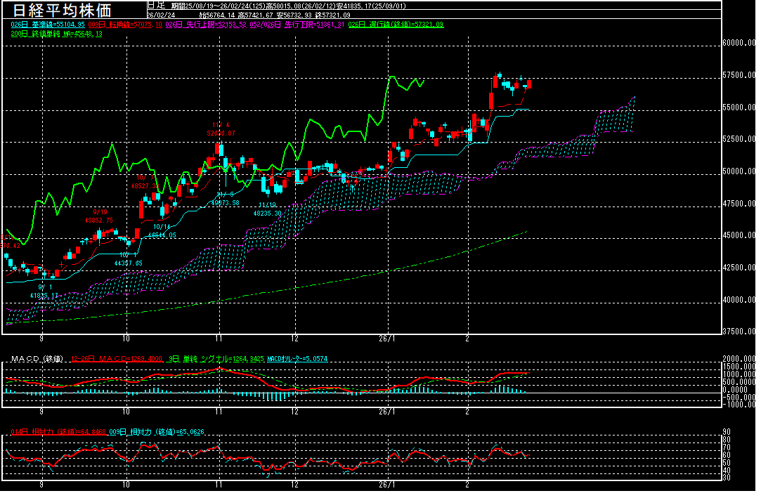 日経平均株価は前営業日比495.39円高の57321.090円で終了となり、反発。先週末に米連邦最高裁が「相互関税」を違憲と判断し、無効にしたことを受けて、トランプ米大統領は24日に「相互関税」の代替措置となる10%の追加関税を24日に発動。米関税政策の先行き不透明感が強まる中、売りが先行する場面も見られたものの、先週末に大きく下げた反動で、自律反発を期待した買いが入ったようです。また、日本の対米投資計画が継続するとの思惑から、関連銘柄が買われて相場を押し上げる中、57421.67円まで上昇する場面も見られております。