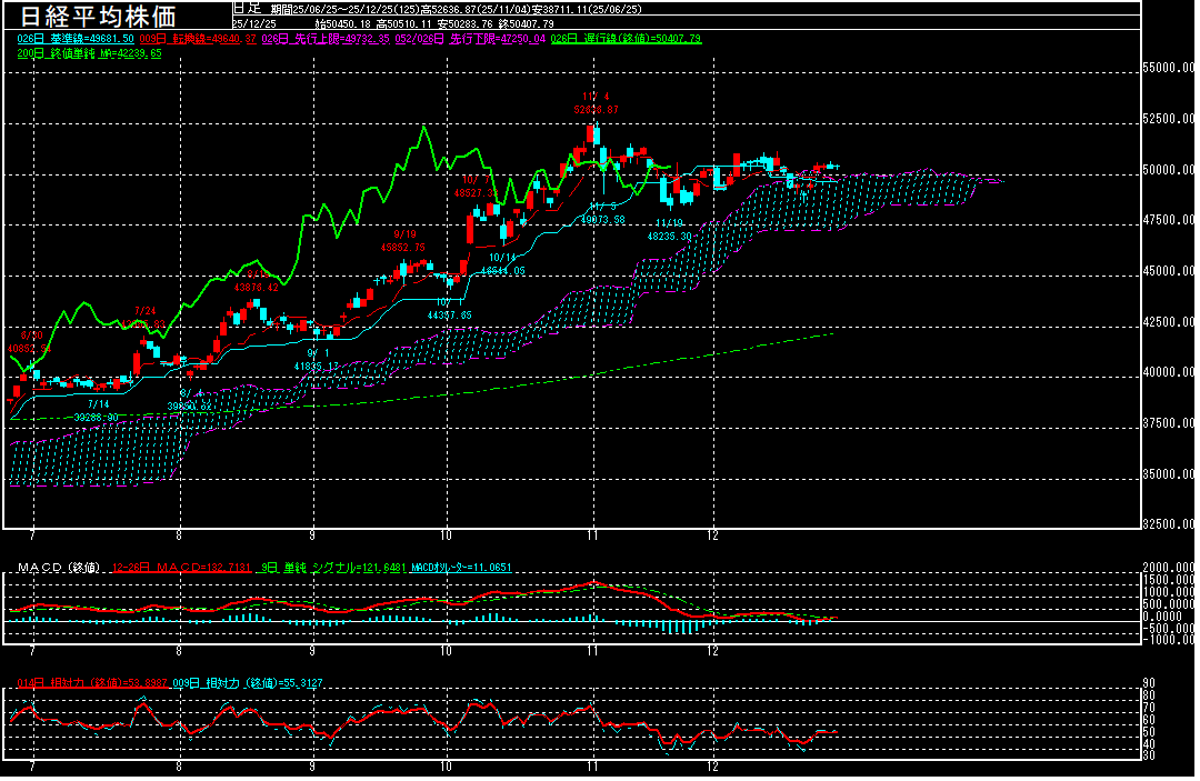 日経平均株価は前営業日比63.69円高の50407.79円で終了。引き続き海外投資家の参加が少なく、相場全体の明確な方向感が出にくい中、年末を控えたポジション調整の動きも強まり、小反発となりました。なお、東証プライム市場の売買代金は2兆9824億円と、2023年12月28日(2兆6966億円)以来2年ぶりに3兆円を割り込んでおります。