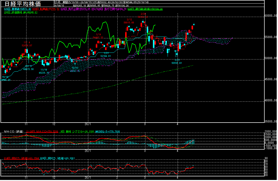 日経平均株価は前営業日比256.85円高の58134.24円で終了となり、続伸。3月2日以来の58000円台を回復しております。米国とイランの和平協議進展への期待が拡がる中、引き続き半導体関連株を中心に幅広い銘柄が買われた模様。前日の高値57979.82円を上抜いて、58585.95円まで上昇する場面も見られております。
