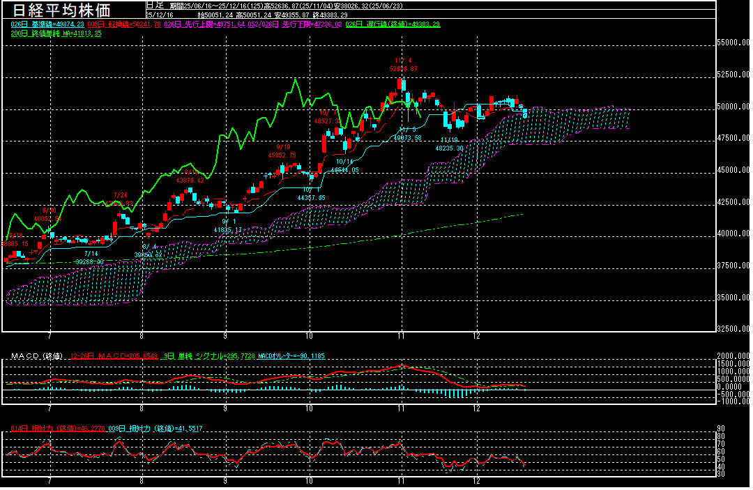 日経平均株価は前営業日比784.82円安の49383.29円で終了となり、続落。今晩に11月米雇用統計の発表を控える中で様子見姿勢が強まり、積極的な買いが入らず。一時49355.87円まで下げるなど、12月3日以来9営業日ぶりに50000円割れで終了しております。昨晩の米国市場で、ハイテク株の一角に売りが続いたことも.嫌気された模様。25日平均線を割り込んで終了しただけに、目先は1日の安値49215.96円を維持出来るかが焦点となりそうです。