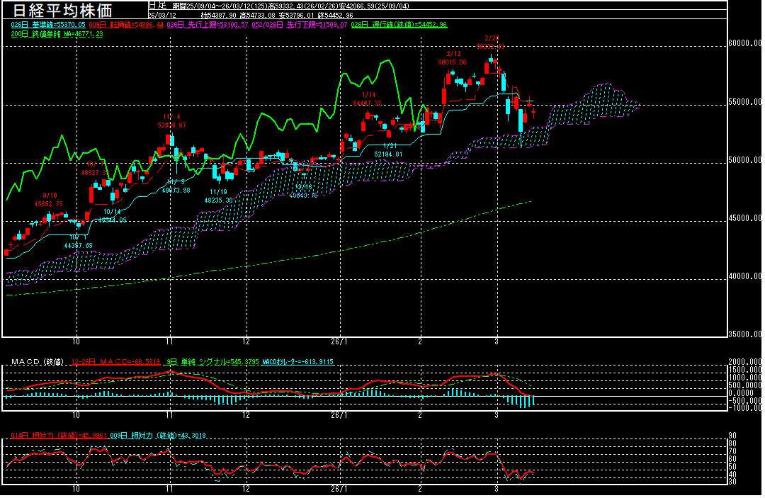 高市首相による政策期待から安値は買い拾われ易い一方、イラン情勢の緊迫化が続く中、世界景気の先行き不安が強く、積極的には買いづらい地合いが続いております。テクニカル的にもMACDは下げ基調が続いているだけに、しばらくは75日平均線から25日平均線のレンジで推移しそうです。
