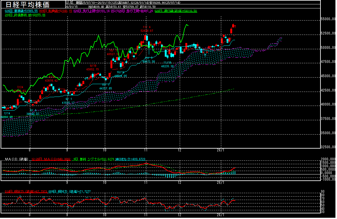 昨晩の米国市場で主要3指数が続落したことを受けて、半導体関連銘柄を中心に売られる展開となりました。テクニカル的な買われ過ぎ感が強まる中、買い方の利喰い売りも出たようで、53709.87円まで下げる場面も見られております。ただ、日本株の先高観が強い中、押し目は買い拾われた模様。終値では54000円を維持しております。