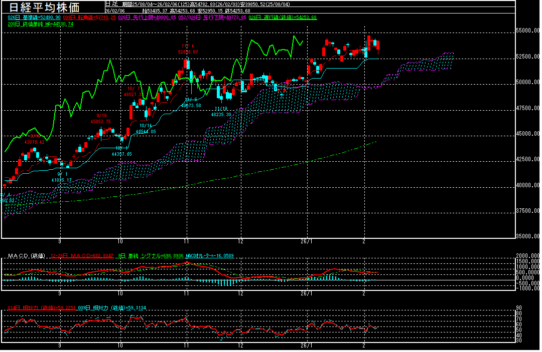 目先は2月8日に投開票日を迎える衆院選の結果次第の展開となりそうです。選挙情勢通り、このまま自民党が圧勝するようですと、高市首相が財政拡張的な政策を進め易くなるとの思惑が強まりそうです。その場合、最高値を更新し、55000円台に乗せて来ることも想定されます。