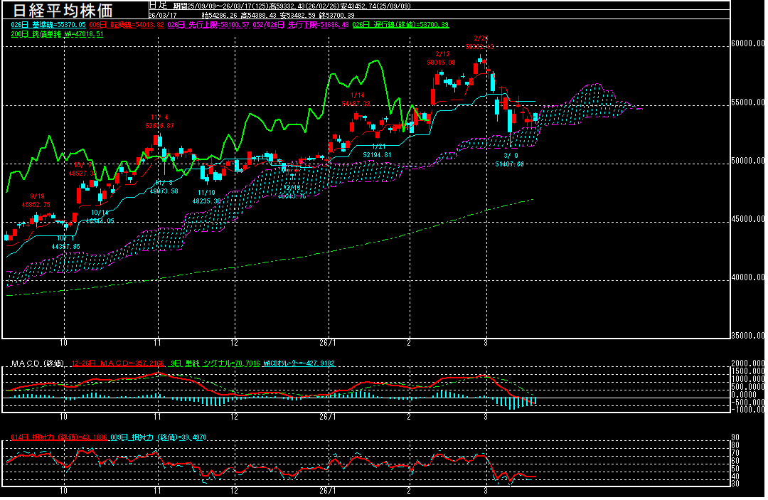 日経平均株価は前営業日比50.76円安の53700.39円で終了となり、4営業日続落。