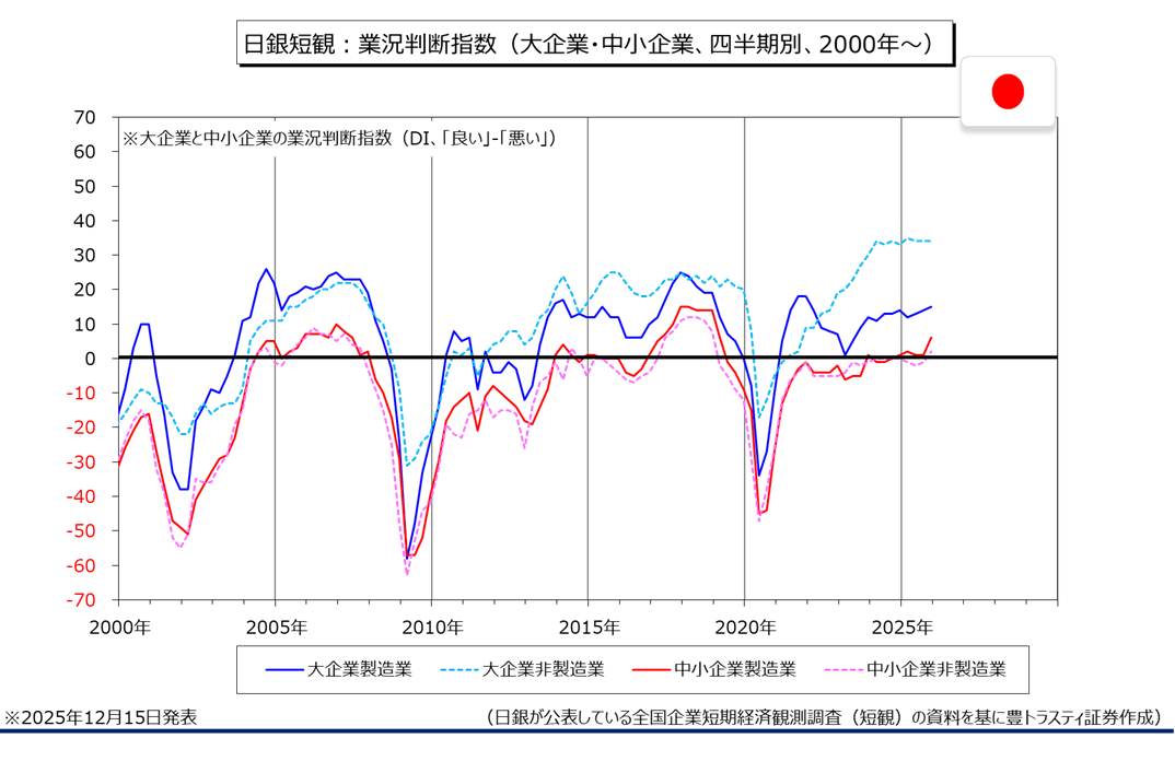 日銀が発表した12月全国企業短期経済観測調査(短観)によると、企業の景況感を示す業況判断指数(DI)は大企業製造業でプラス15となり、前回9月調査(プラス14)から1ポイント改善しました。改善は3四半期連続で、2021年12月以来4年ぶり高水準となっております。トランプ米政権の高関税政策に伴う影響が限定的だったことに加え、生成AI(人工知能)の利用拡大に伴う堅調な半導体需要が寄与した模様。DIは、業況が「良い」と答えた企業の割合から「悪い」を引いて算出されます。