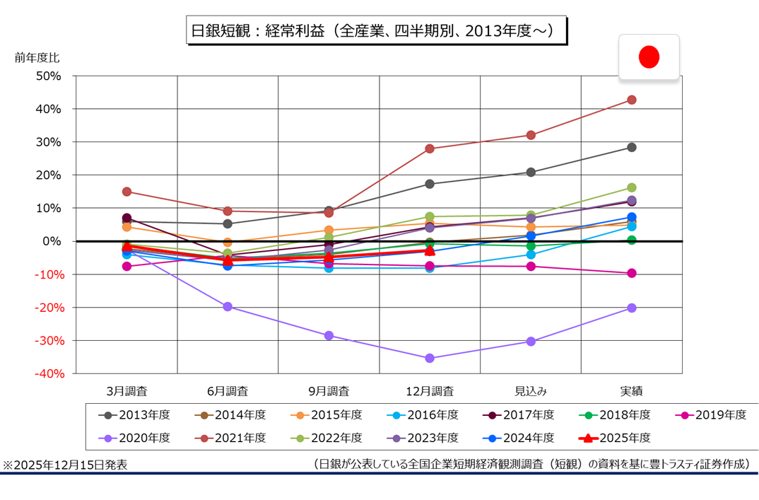 全規模全産業の2025年度経常利益見通しは前年度比2.7%減と、減益ながら前回9月調査(4.8%減)から改善。