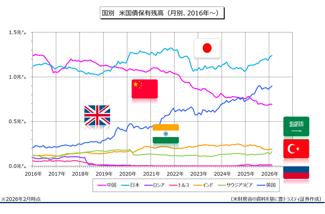 国別で見てみると、米国債の3大保有国で、残高首位の日本は同140.0億ドル増の1兆2393億ドル、2位の英国は同176.0ドル増の8973億ドルと、共に2ヶ月連続で増加。日本は2022年2月(1兆3030億ドル)以来の高水準となっております。一方、3位の中国は同11.0億ドル減の6933億ドルと、減少に転じました。インドは同2.0億ドル増の1906億ドルと、2ヶ月連続で増加。