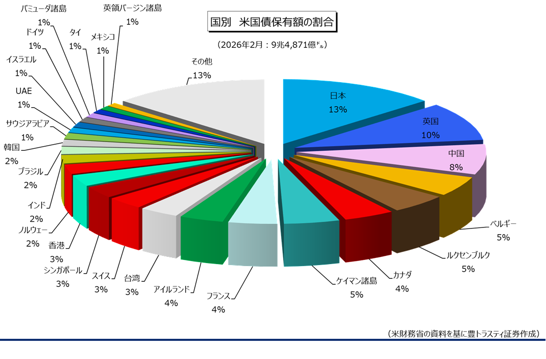 米財務省が4月15日に発表した米国際資本収支統計(季節調整前)によると、2026年2月末の海外投資家の米国債保有額は前年同月比1977.0億ドル増加の9兆4871億ドルと、2ヶ月連続で増加。過去最高を更新しました。