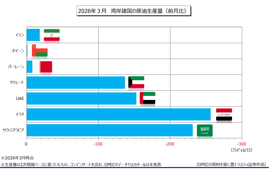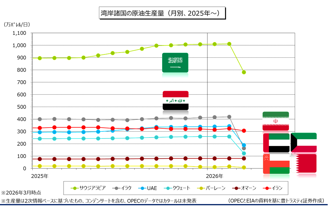 米国・イスラエルとイランの軍事衝突に伴い、湾岸産油国の石油施設がイランの標的となり、攻撃を受けて操業停止が相次いだ模様。また、イランがホルムズ海峡を事実上封鎖する中で輸出が急減し、減産に追い込まれた様です。