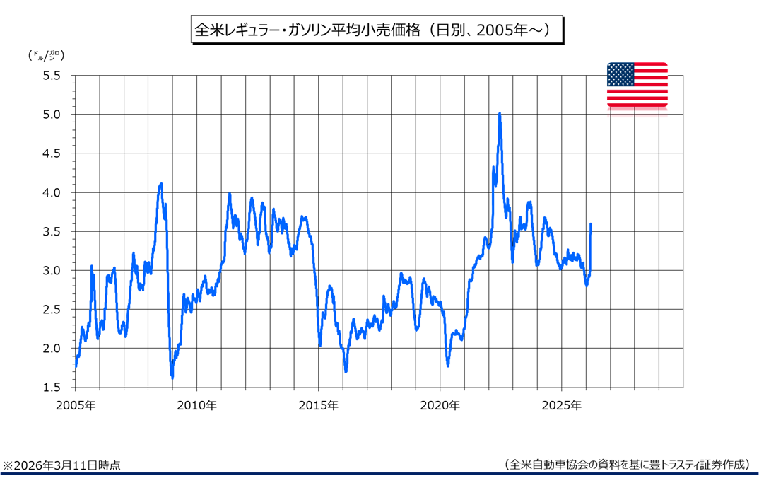 米ガソリン小売価格が3月11日に、平均で1ガロン=3.58ドルと、2024年5月以来の高値を付けております。米国とイスラエルによるイランへの攻撃を受けて、わずか11日間で20%上昇。4年前にロシアがウクライナに侵攻した際と同水準となり、異例の高騰がつづいております。