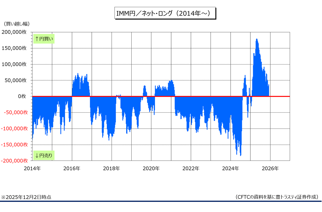 最後に、米商品先物取引委員会(CFTC)のデータによると、大口投機家のIMM通貨(円)のネット・ロングは12月2日時点で前週比9901枚増加の3万6418枚と、6週ぶりに増加に転じました。