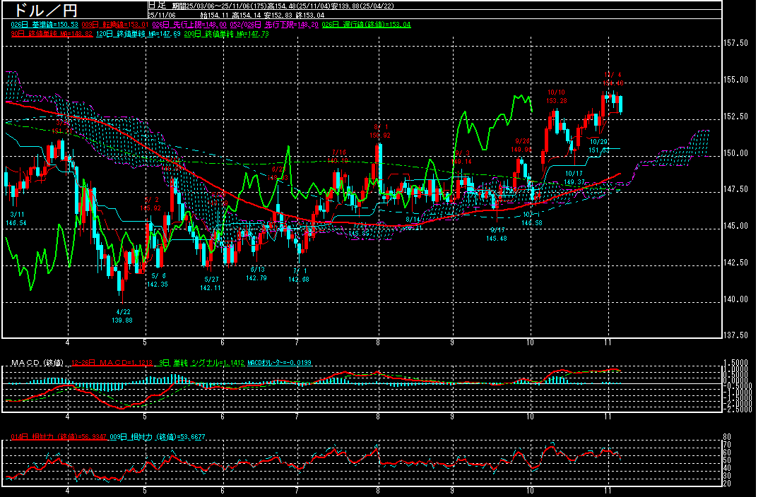米ドル・円は、FRBのパウエル議長が10月のFOMC(米連邦公開市場委員会)後の記者会見で、「(12月会合での利下げは)既定路線ではない」と発言。また、ブラックアウト期間が明けてFRB高官の発言が相次ぎ、雇用とインフレへのリスク対処を巡り、FRB内で依然として見方が割れていることが浮き彫りとなる中、12月のFOMCでの追加利下げ観測が後退。円売り・ドル買いの動きが強まる中、11月4日に154.48円まで円安が進む場面もみられております。
